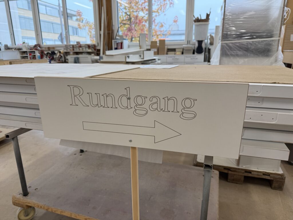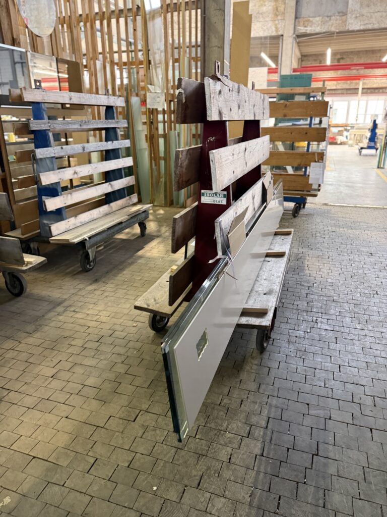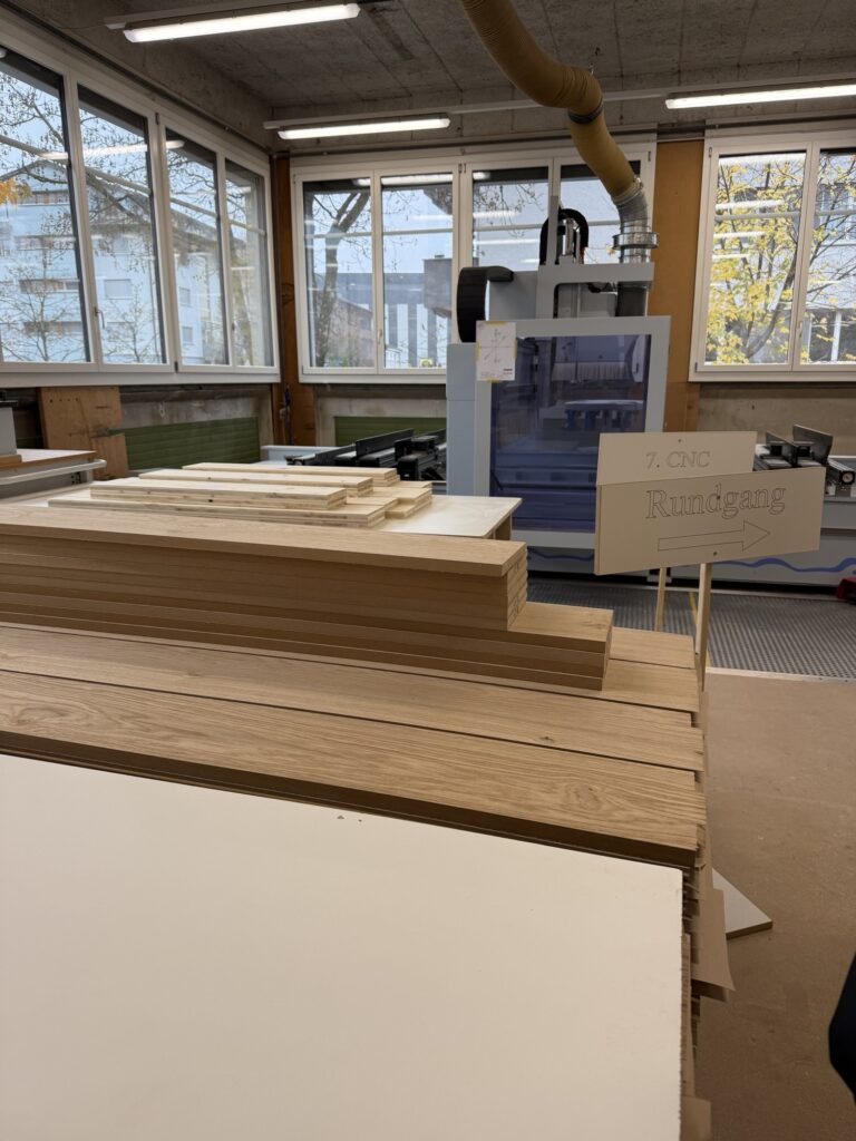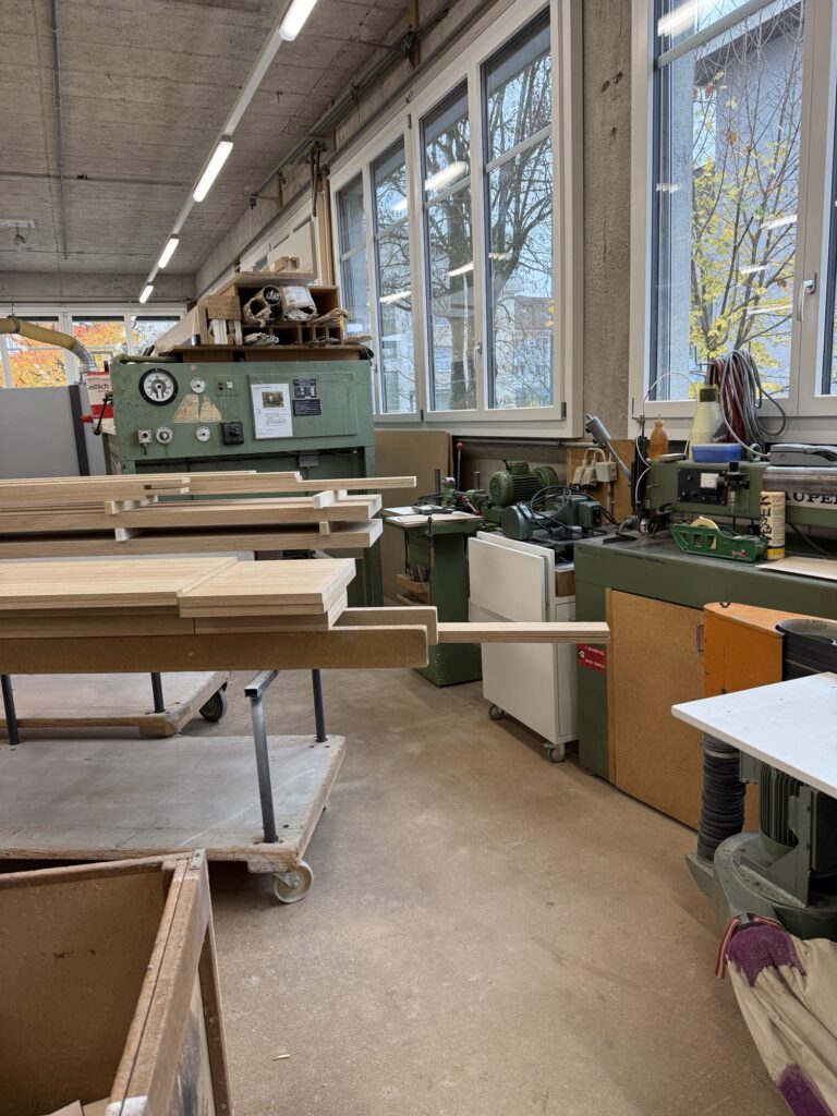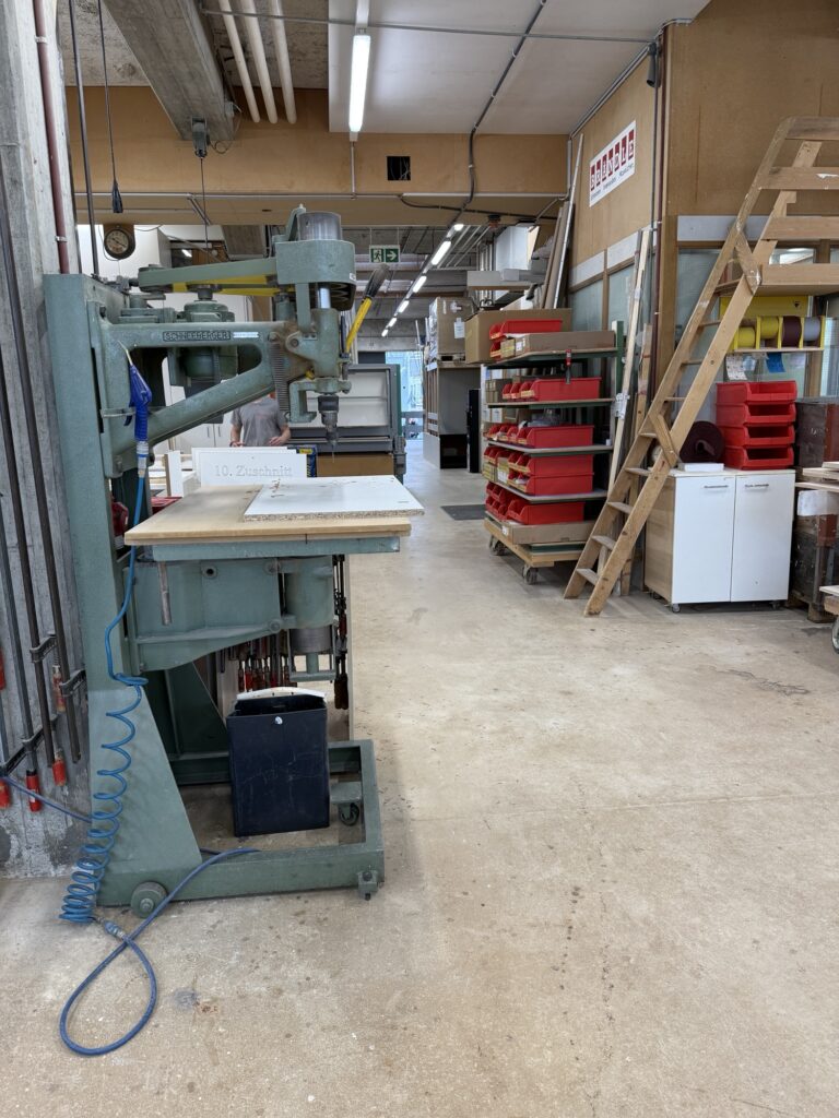 Wir möchten die Schreinerei Brändle angucken, ein Familienbetrieb, welcher seit 1961 besteht, und heute in der dritten Generation geführt wird. Ein sauberer, aufgeräumter Arbeitsort erwartet uns, es sind mehrere Leute hier, der Inhaber selber führt uns durch den Betrieb.
