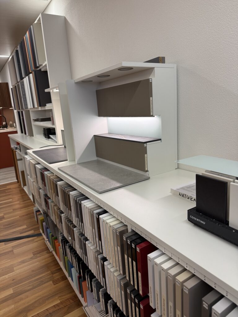 Herr Brändle führt uns noch durch die Ausstellung, die frisch montierte Küche gefällt uns sehr gut. Auch das Modell mit den auswechselbaren Fronten und Abdeckungen vermögen uns zu begeistern.