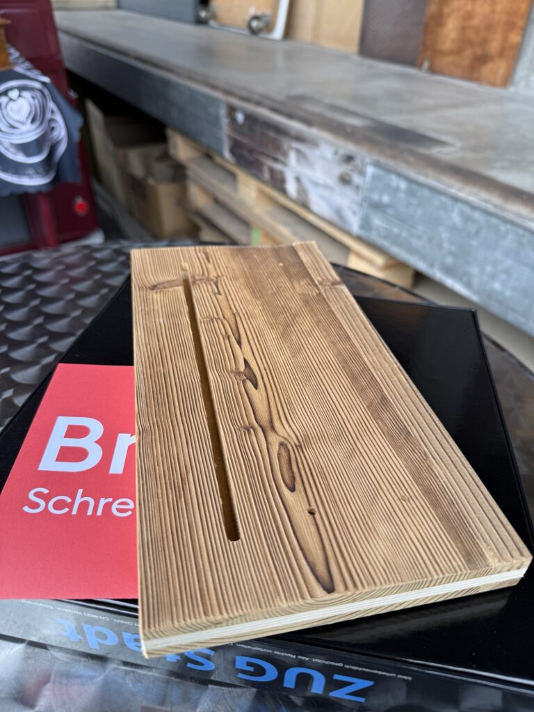 Wir kriegen ein söttiges Holzbrett in die Hand gedrückt.