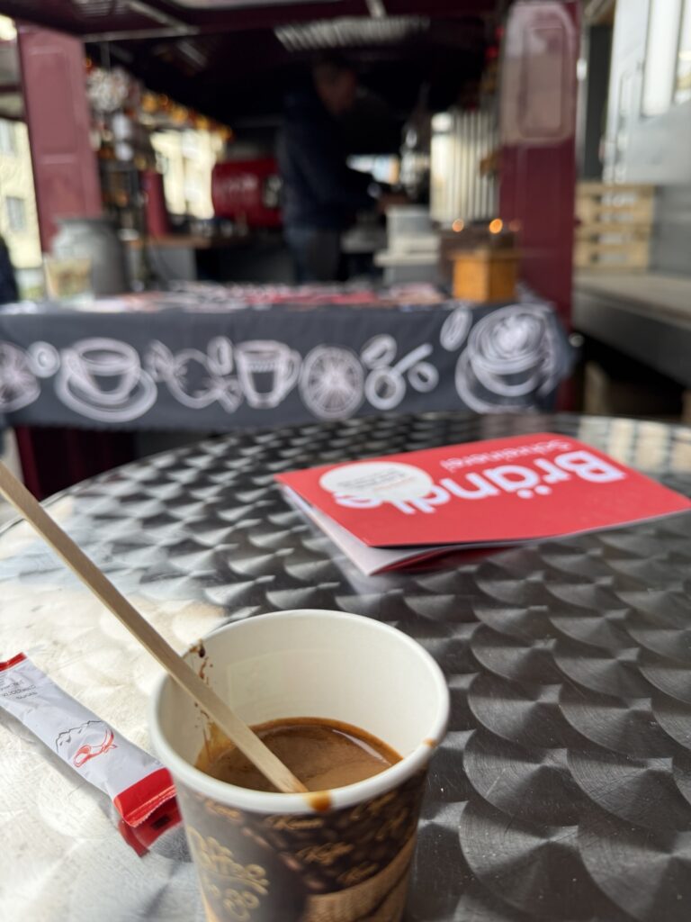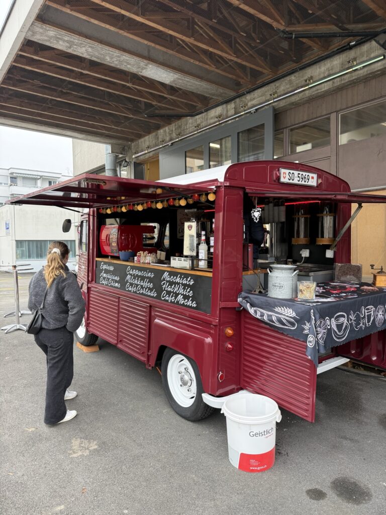 Wir genehmigen uns nochmals einen feinen Kaffee vom Kaffeemobil auf der Rampe von der Schreinerei Brändle.