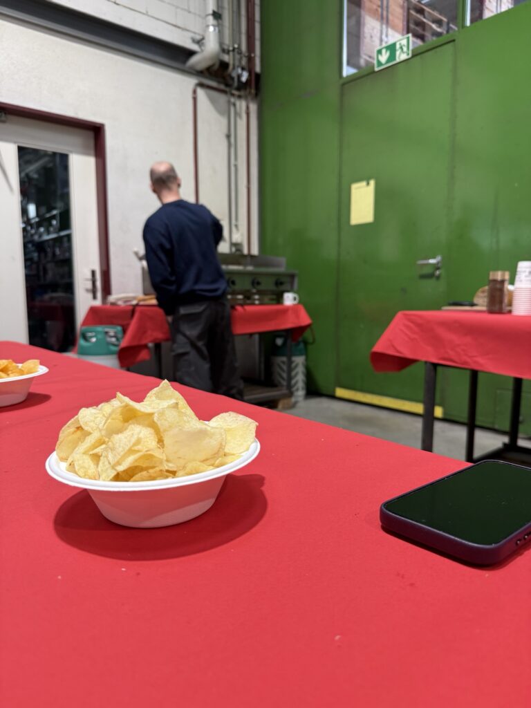 Wir werden sogar zu Wurst und Brot eingeladen. In der Werkstattshalle auf dem Grill gebraten.