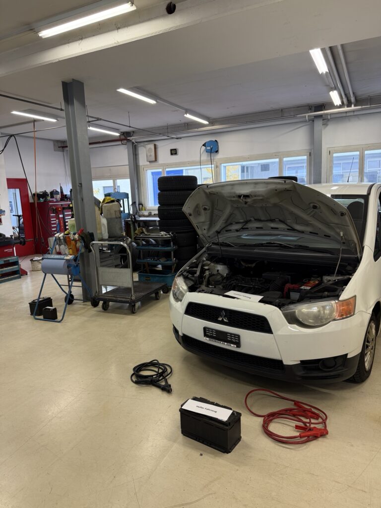 Hier lernen wir, wie man richtig eine Batterie überbrückt (Erst die funktionierende Batterie mit dem roten Kabel am Plus anhängen, dann die platte Batterie. Das schwarze Minuskabel an den funktionierenden Minuspol zur Masse des stehengeblieben Autos- möglichst weit von der Batterie weg—> hättsches gwüsst?).