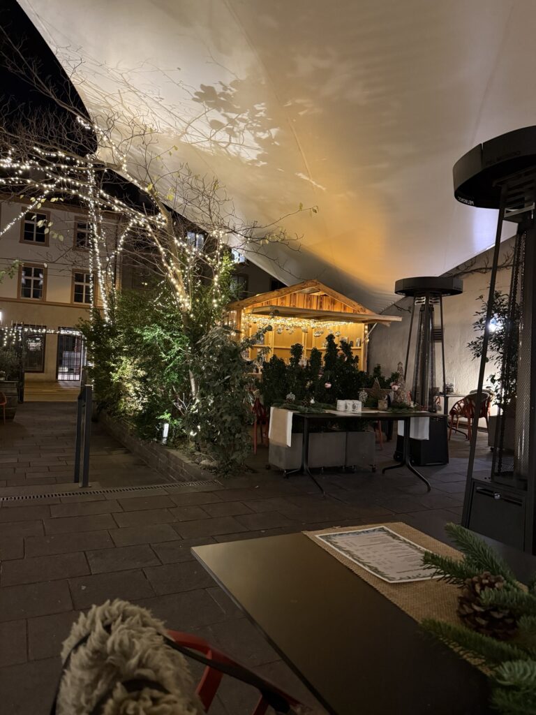 Mit dem weissen Glühwein auf dem Hotelhof mussten wir uns ungewöhnlich gedulden, aber irgendwann bekamen wir zwei Kafi Zwetschgen Gläser mit weissem Glühwein in die Hände gedrückt.