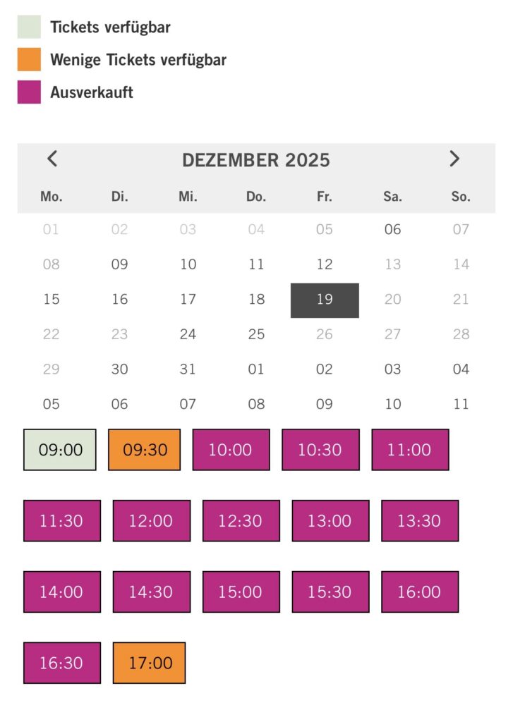 Da war wochenweise bereits schon alles ausgebucht (violett)! Ich entschloss mich für das 9.30 Uhr Zeitfenster, irgendwie kommen wir dann schon nach Riehen. Am Nachmittag oder gegen Abend wollte ich nicht, also fixiere ich den Termin am Morgen.